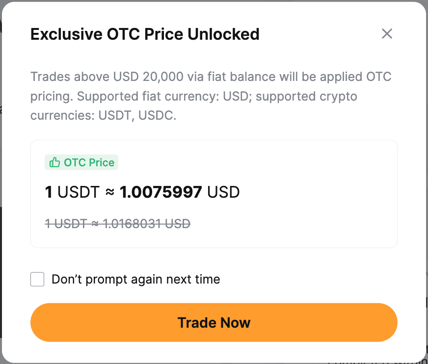 — OTC価格は、USDT、USDC、ETH、BTC、MNT間の暗号資産の両替にのみ適用されますのでご注意ください。OTC取引の詳細については、よくある質問 — OTC取引をご参照ください。