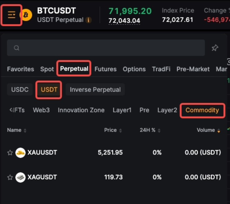 先物取引ページで、左上のシンボル ドロップダウンメニューを開き、無期限 → USDT → コモディティの順に進みます。