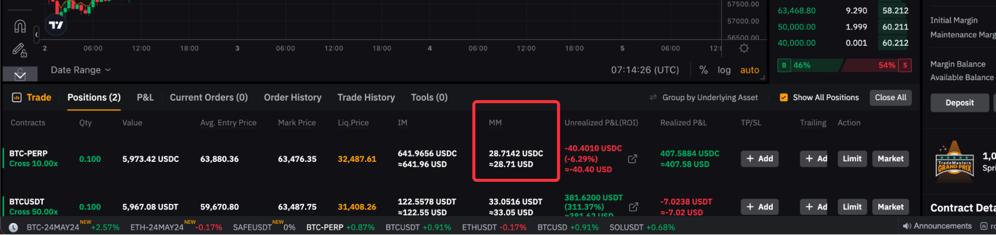 ポジションタブに表示されるMMは、ポジション決済手数料が含まれているため、高くなる可能性があります。