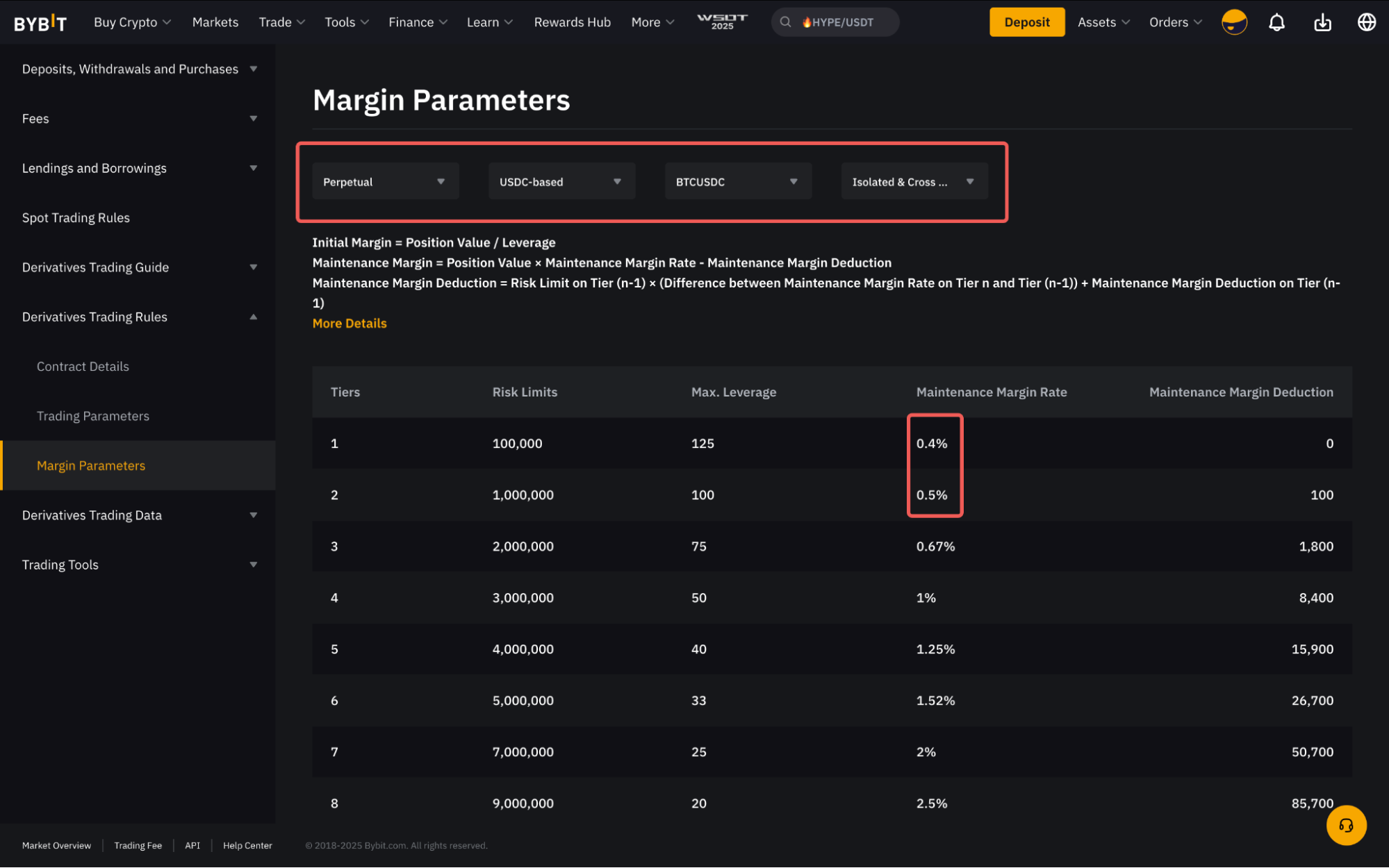 各リスク制限階層に必要なMMRと維持証拠金控除額は、マージンパラメータページで簡単に確認できます。