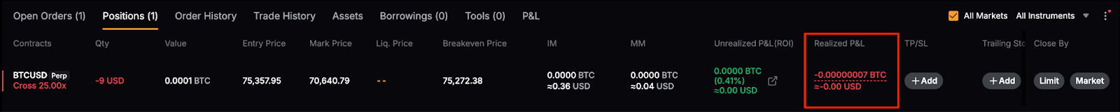 前述の計算に基づくと、ポジションの未実現損益 = 0.0004 BTC