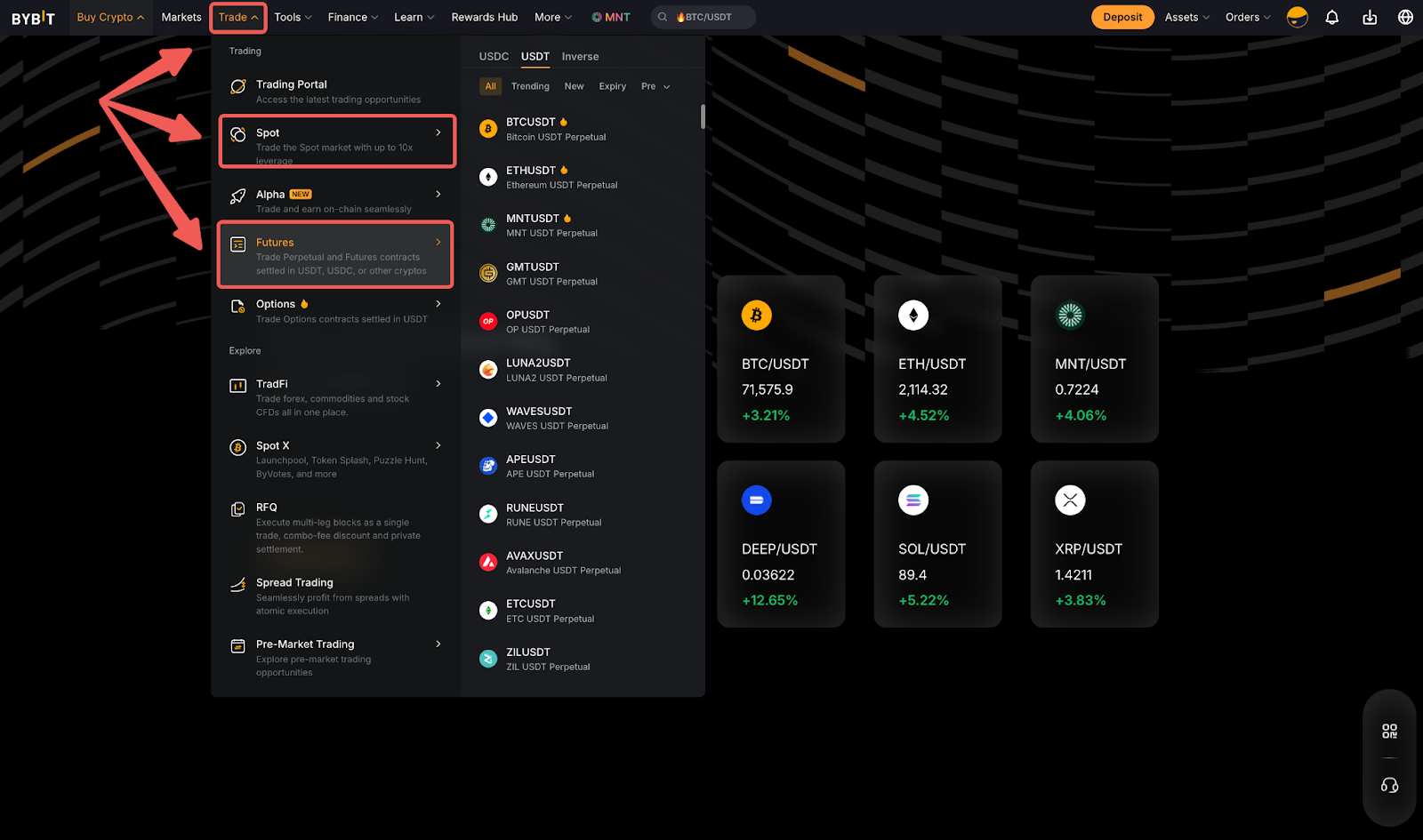 ステップ1:Bybitのホームページで、取引ドロップダウンメニューに移動し、現物または先物取引のいずれかを選択します。次に、取引したい契約を選択します。