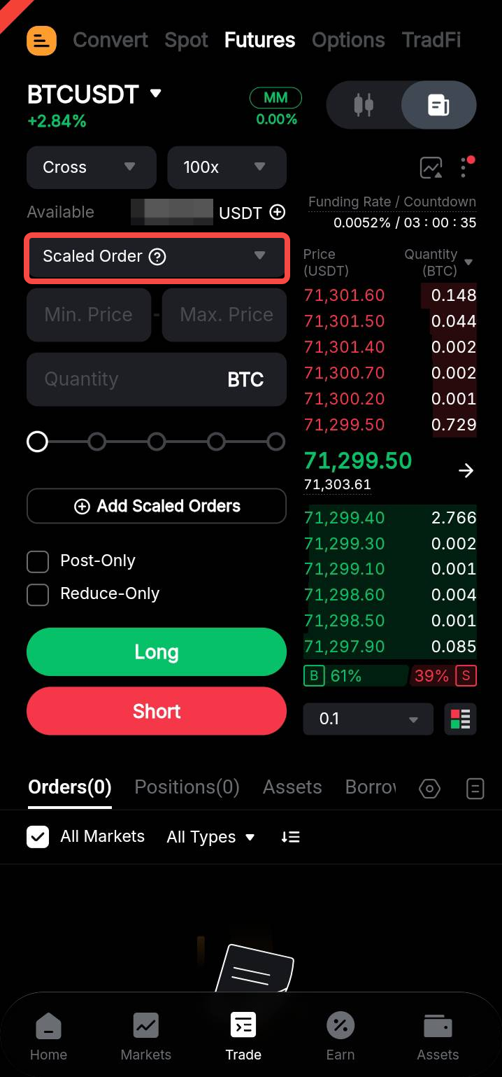 アプリの場合、「取引」タブに移動します。注文の種類のドロップダウンメニューをタップし、「分割注文」を選択します。ご希望の価格範囲(分割注文の上限と下限)と数量を入力します。