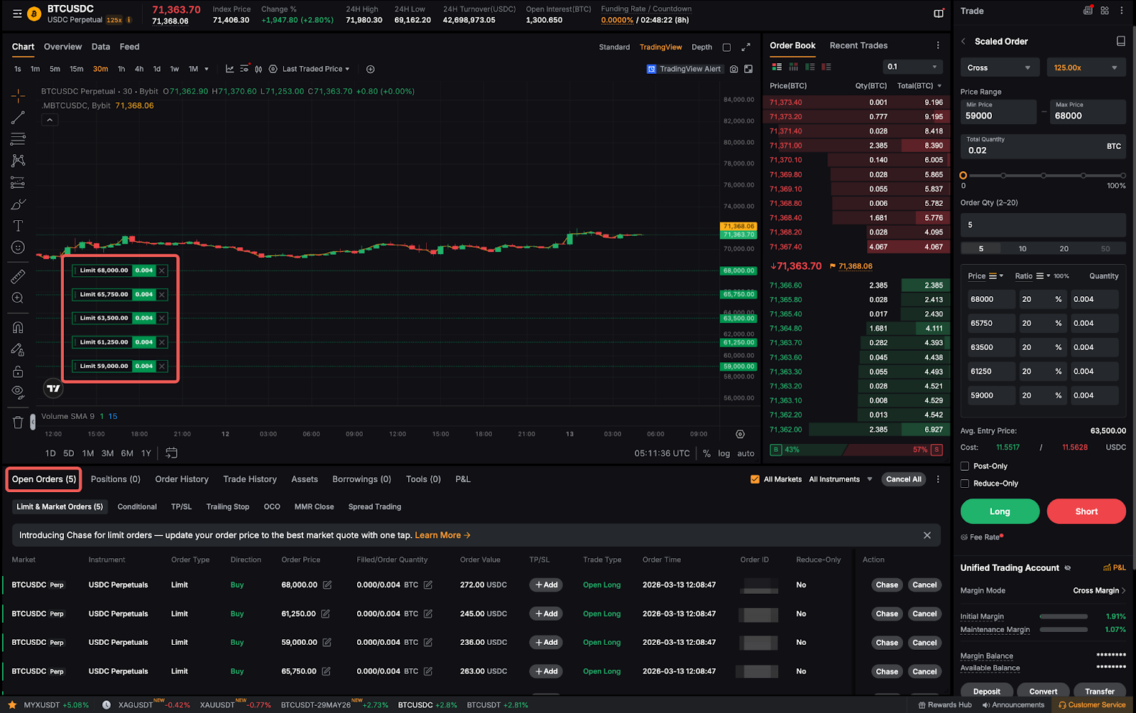 分割注文を送信した後、お客様のチャートは更新され、分割注文の価格別に表示されます。発注した指値注文は、オープンオーダー タブで確認できます。