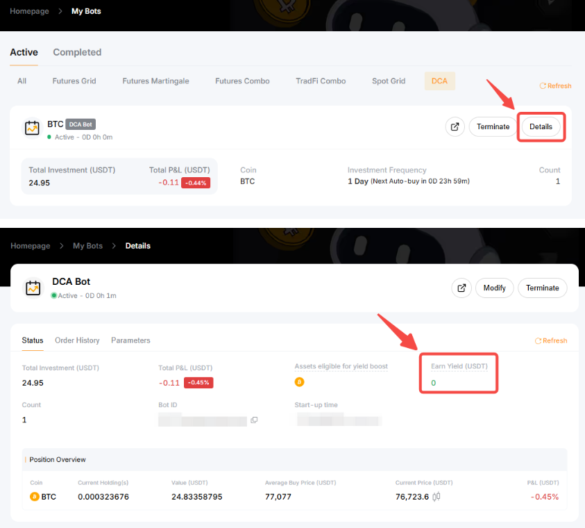 Please head to My Bots to view all active and completed trades. Click on Details to view the details of the yield generated under Earn Yield.
