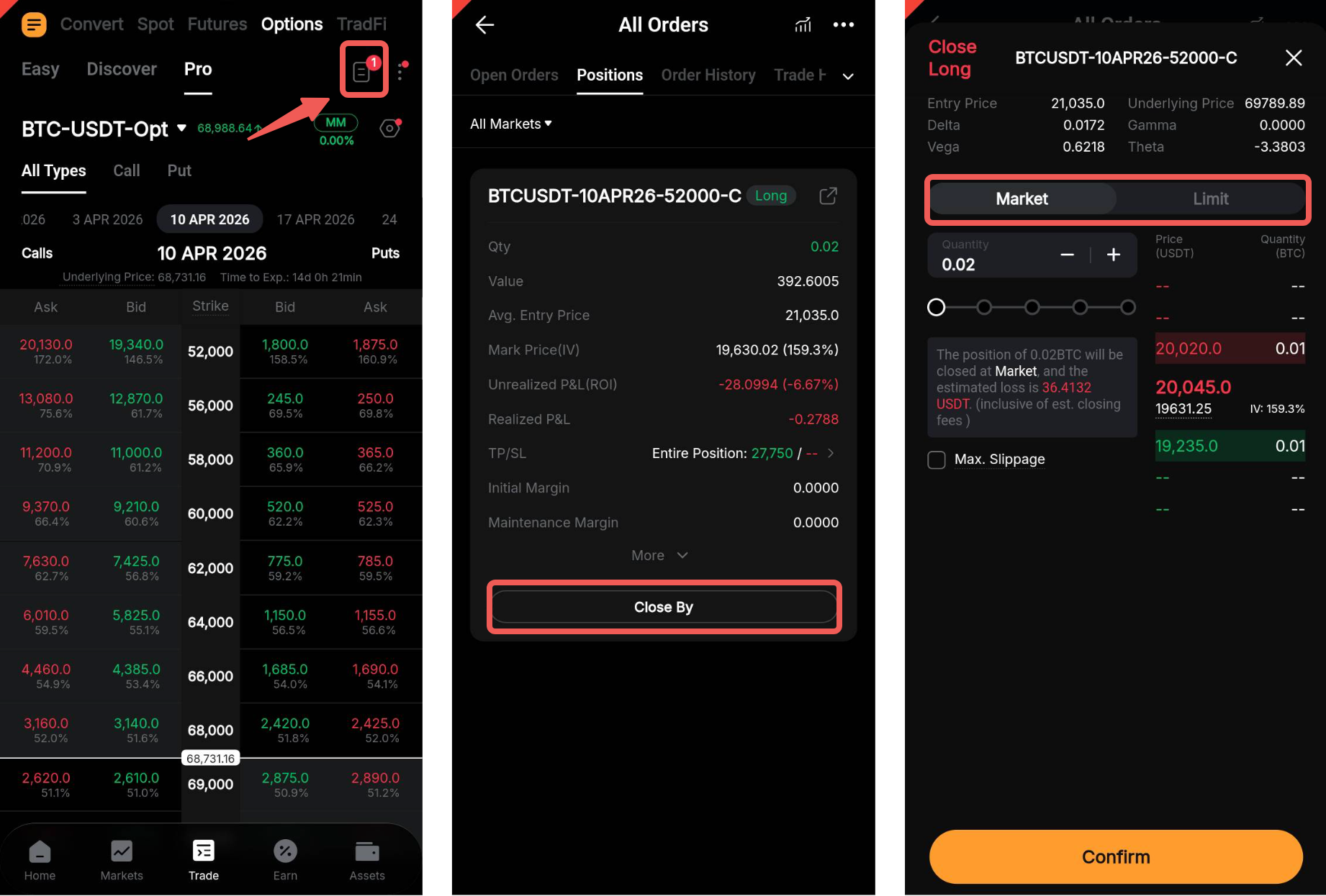 The number of active positions is indicated by the History icon on the Options Chain page. Tap the icon to access the All Orders page, then select Positions → Close By. From there, choose either Limit or Market.
