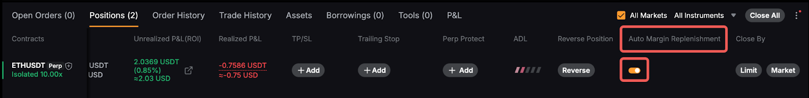 Vá para a página de Negociação, localize sua posição na aba Posições sob o gráfico, e alterne o Interruptor de Reabastecimento Automático de Margem para ativá-lo ou desativá-lo.