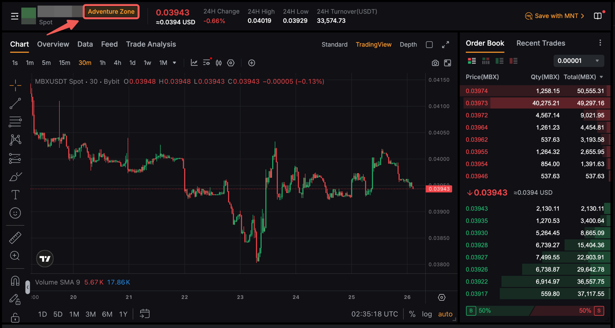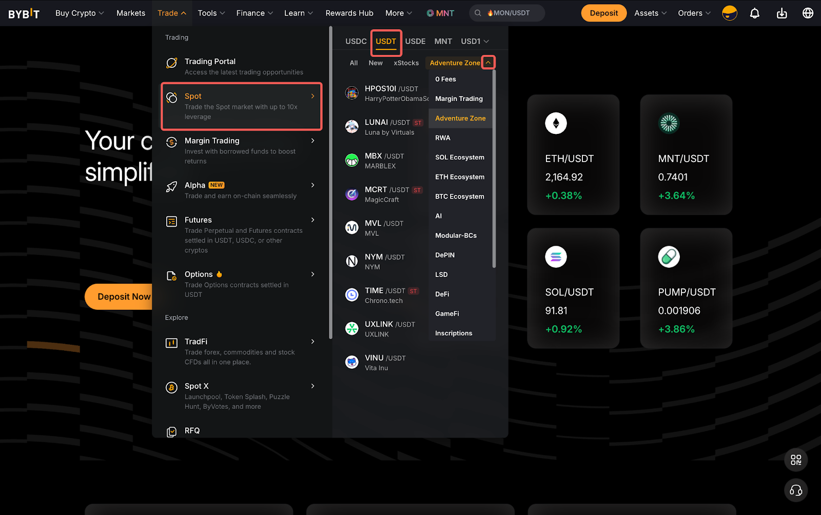Para acessar a Área da Aventura e seus pares de negociação, clique em Trade → Spot, e no menu suspenso sob USDT, selecione Área da Aventura.