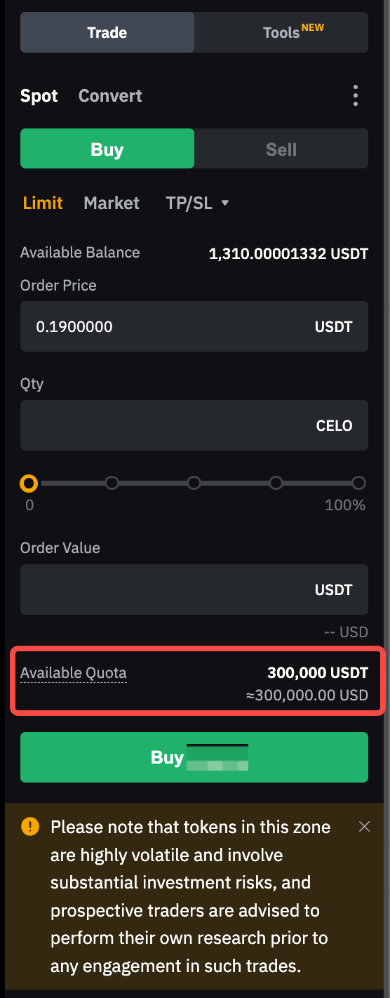 Você poderá encontrar essas informações na seção de Cota disponível, da página de trading. Por exemplo, se a cota disponível para a moeda ABC for de 300.000 USDT e o preço da moeda ABC for de 0,5 USDT, a quantidade máxima de moeda ABC que você pode manter em sua conta será de 600.000 moedas (calculadas como 300.000 USDT ÷ 0,5 USDT = 600.000 moedas).