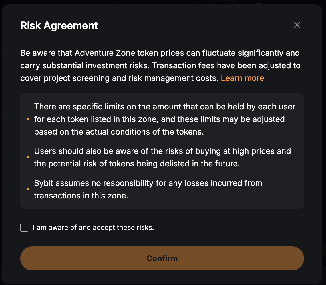 4. Risco de remoção da listagem: a Bybit se reserva o direito de remover da listagem projetos na Área da Aventura caso apresentem riscos excessivos para os traders. Suas oportunidades de trading podem ser limitadas depois que o projeto for removido da listagem.