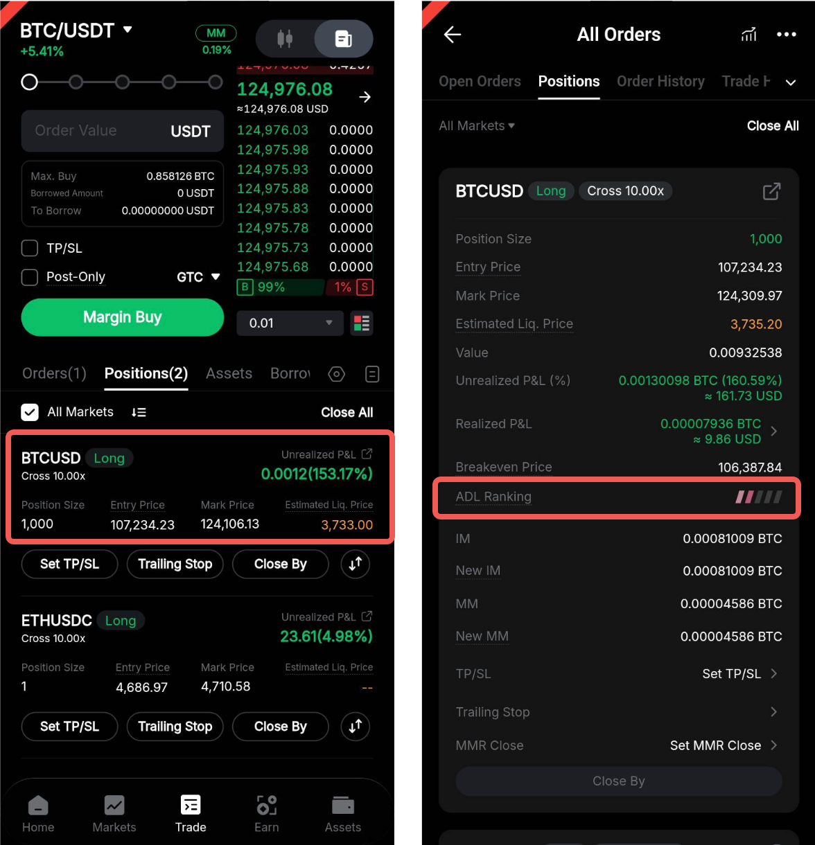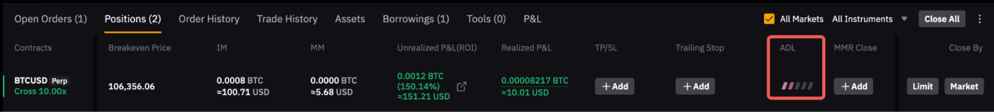 1. Трейдеры с самыми высокими оценками ADL выбираются первыми для делевереджинга. Трейдеры могут ссылаться на индикаторы приоритета ADL на своих позициях, чтобы оценить свои рейтинги ADL.