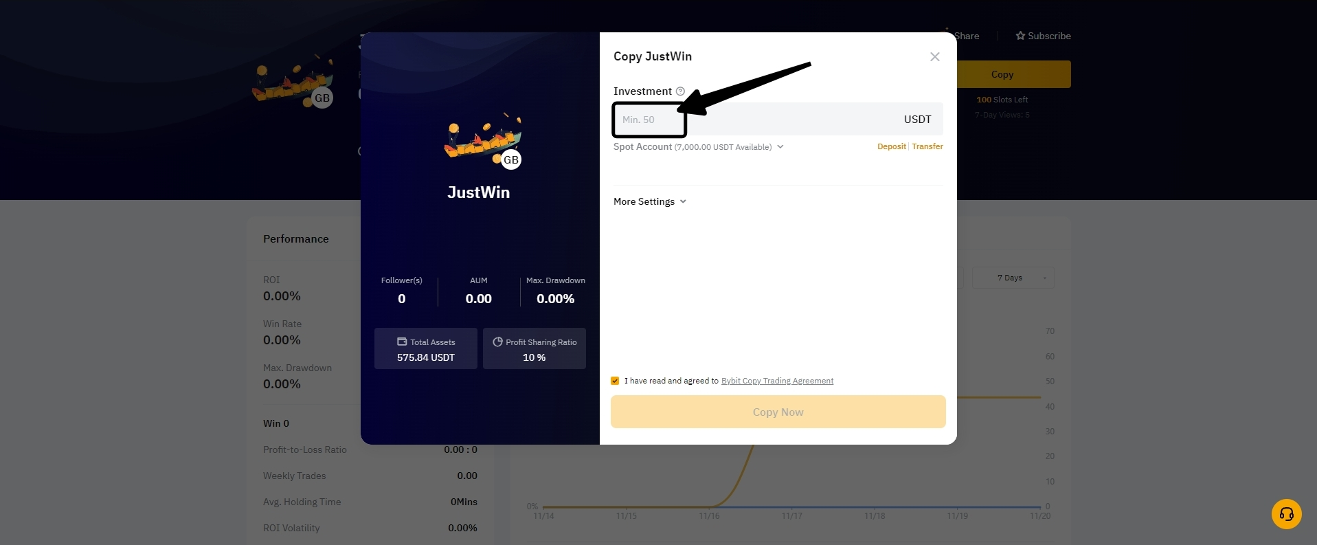 Мастера трейдинга могут установить минимальные инвестиционные требования в диапазоне от 50 USDT до 1000 USDT. Снижение инвестиций до уровня ниже этого минимума ограничено. В окне настройки параметров → Инвестиции можно увидеть определенную минимальную сумму, установленную Мастером трейдинга .