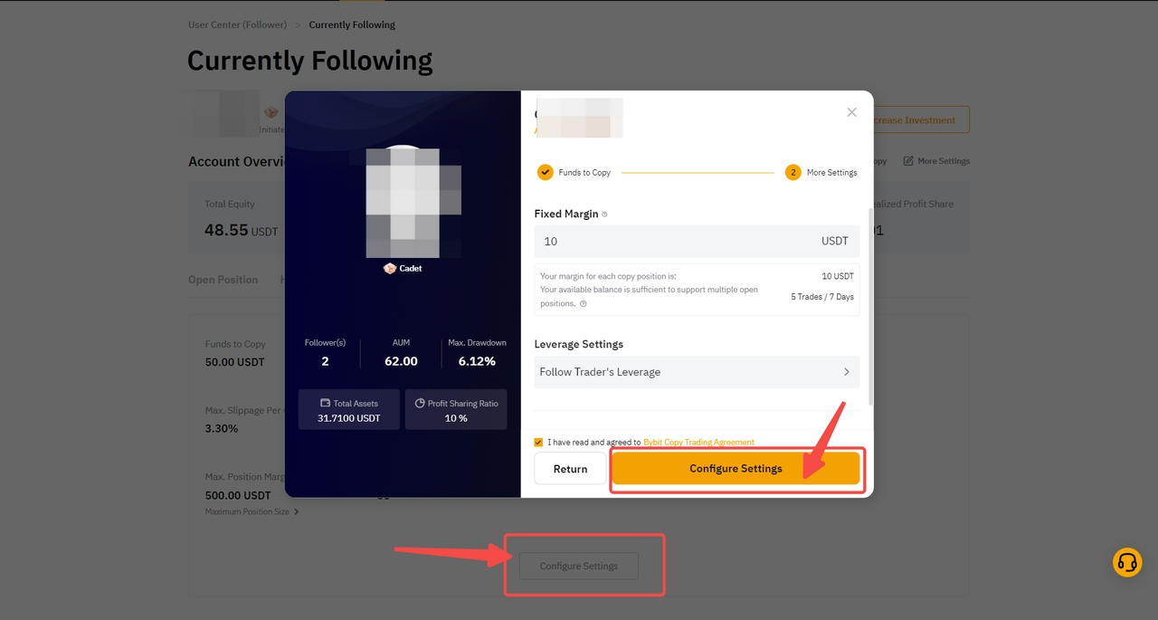 Чтобы выровнять кредитное плечо, увеличьте свои инвестиционные средства и перейдите в настройки копитрейдинга и нажмите « Настройка настроек».