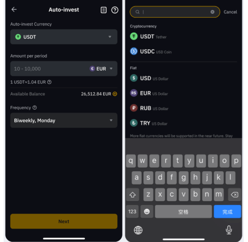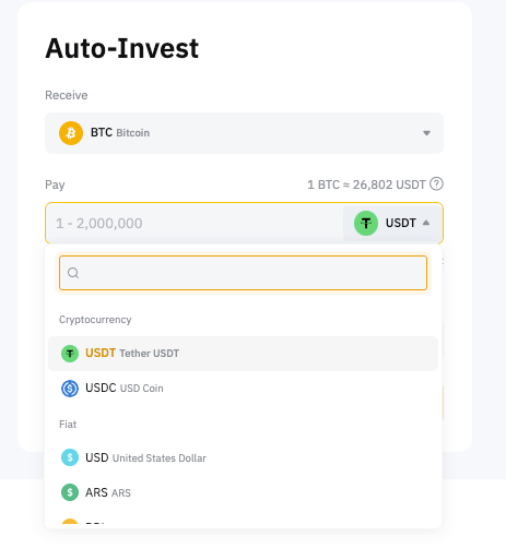 Чтобы просмотреть список доступных криптовалютных и фиатных активов, нажмите на выпадающий список в разделе Автоматических инвестиций.