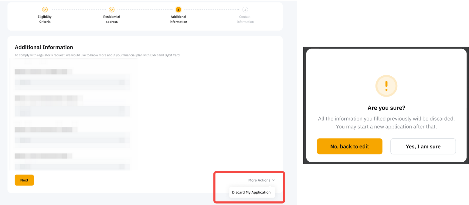 Вы можете отменить заявку на карту Bybit , нажав Просмотреть мою заявкуДополнительные действия и выбрав Отменить мою заявку на карту.