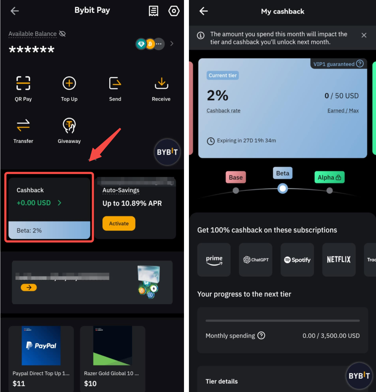 Перейдите на страницу Bybit Pay и нажмите на раздел «Кэшбэк», чтобы просмотреть прогресс. Обратите внимание, что расчёт расходов и прогресс будут сбрасываться в 1-й день каждого календарного месяца.