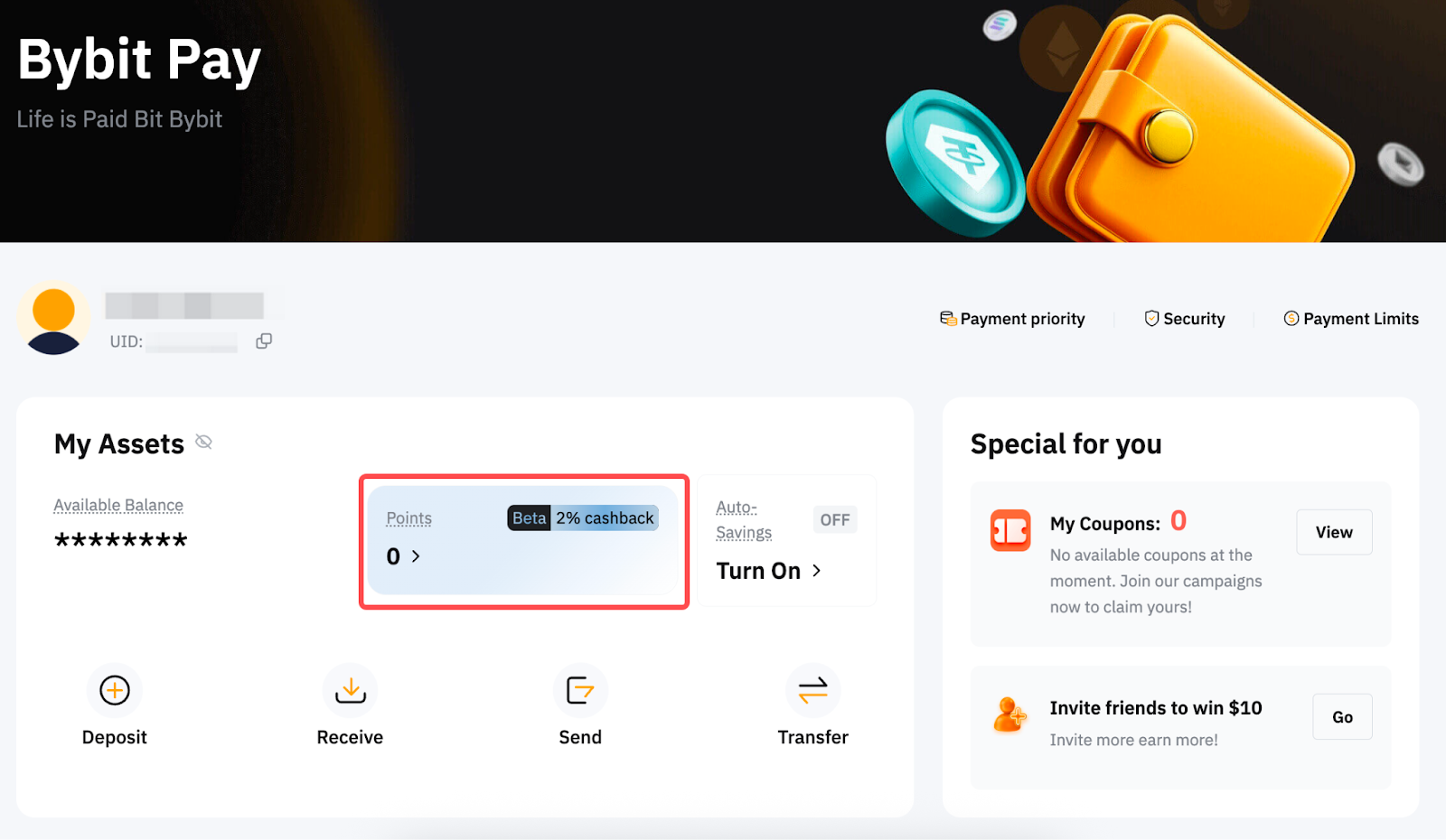 Бонусные баллы можно зарабатывать при оплате с помощью Bybit Pay и карты Bybit. Обратите внимание, что на Bybit Pay можно зарабатывать только теми платежами, которые совершаются продавцу или на сайте партнёров Bybit.
