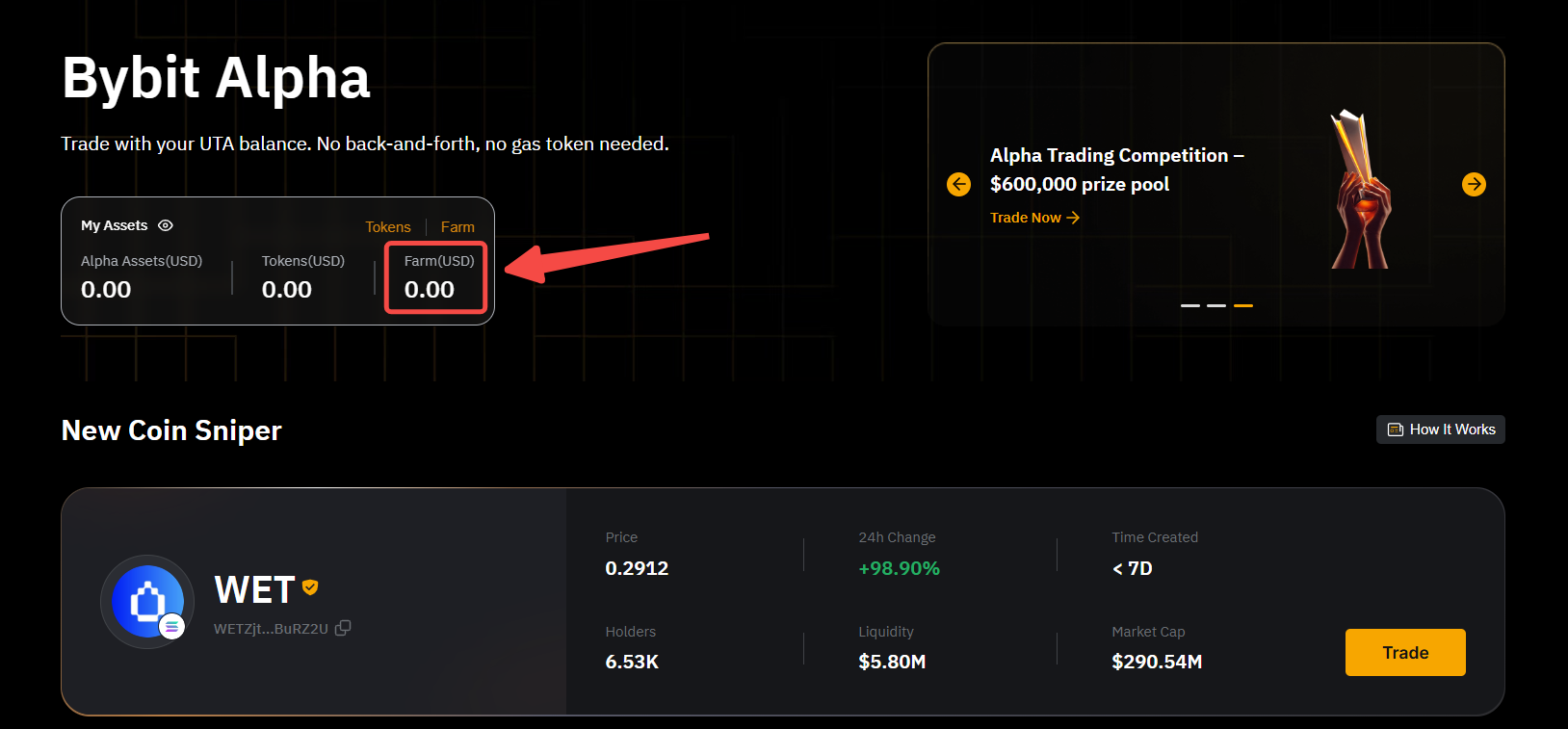 Если вы используете приложение Bybit, перейдите на главную страницу Bybit Alpha → Активы → Ферма.