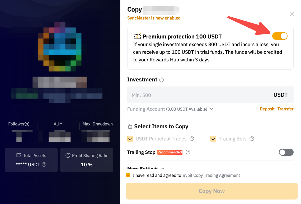 Если у главного трейдера уже открыты сделки, и Джейсон понес убытки в размере 10 USDT, он затем заявляет ваучер Premium Protection Voucher.