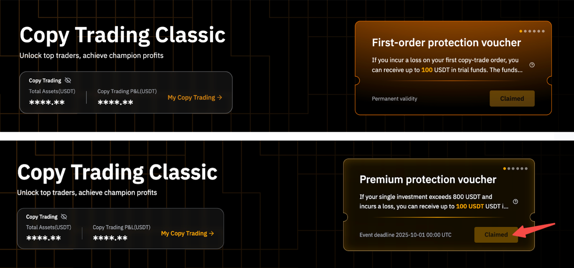 Ваучер Premium Protection: Заявку на нее можно подавать раз в квартал в правом верхнем углу Copy Trading Classic или Copy Trading TradFi. В том же квартале вы имеете право на компенсацию — до 100 USDT — за убытки от одного соответствующего критериям главного трейдера. Данное преимущество может использоваться только один раз в квартал.