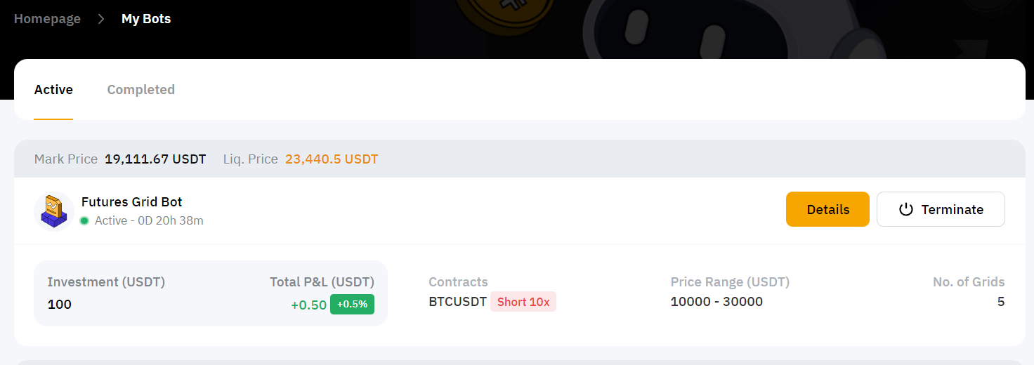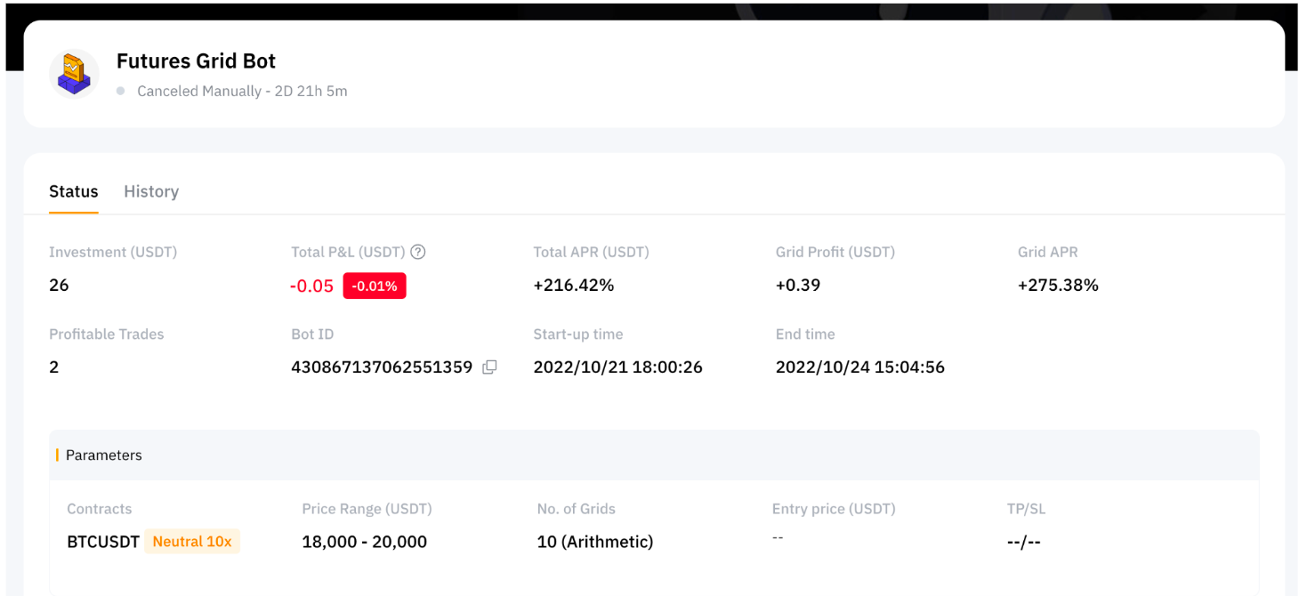 Во время работы grid-бота вся прибыль будет оставаться внутри бота. После прекращения работы бота сумма инвестиций и прибыль будут автоматически переведены на ваш аккаунт Финансирования.