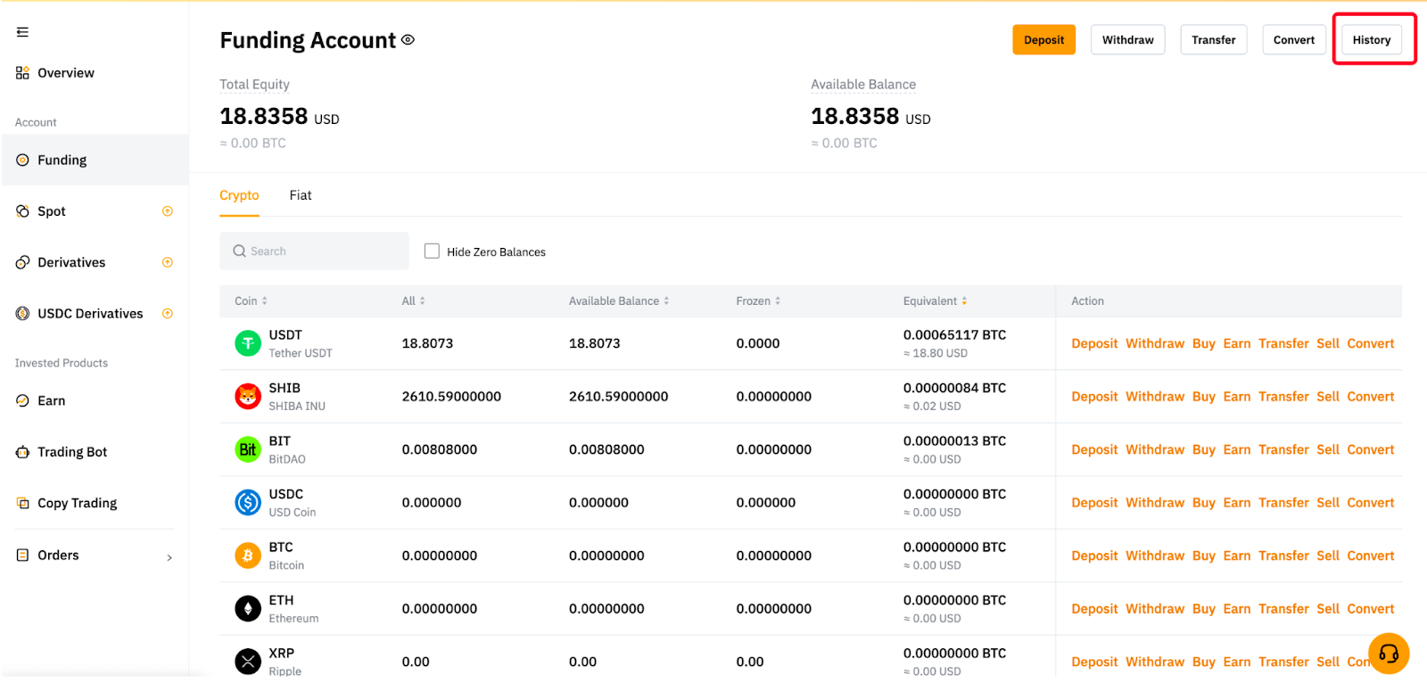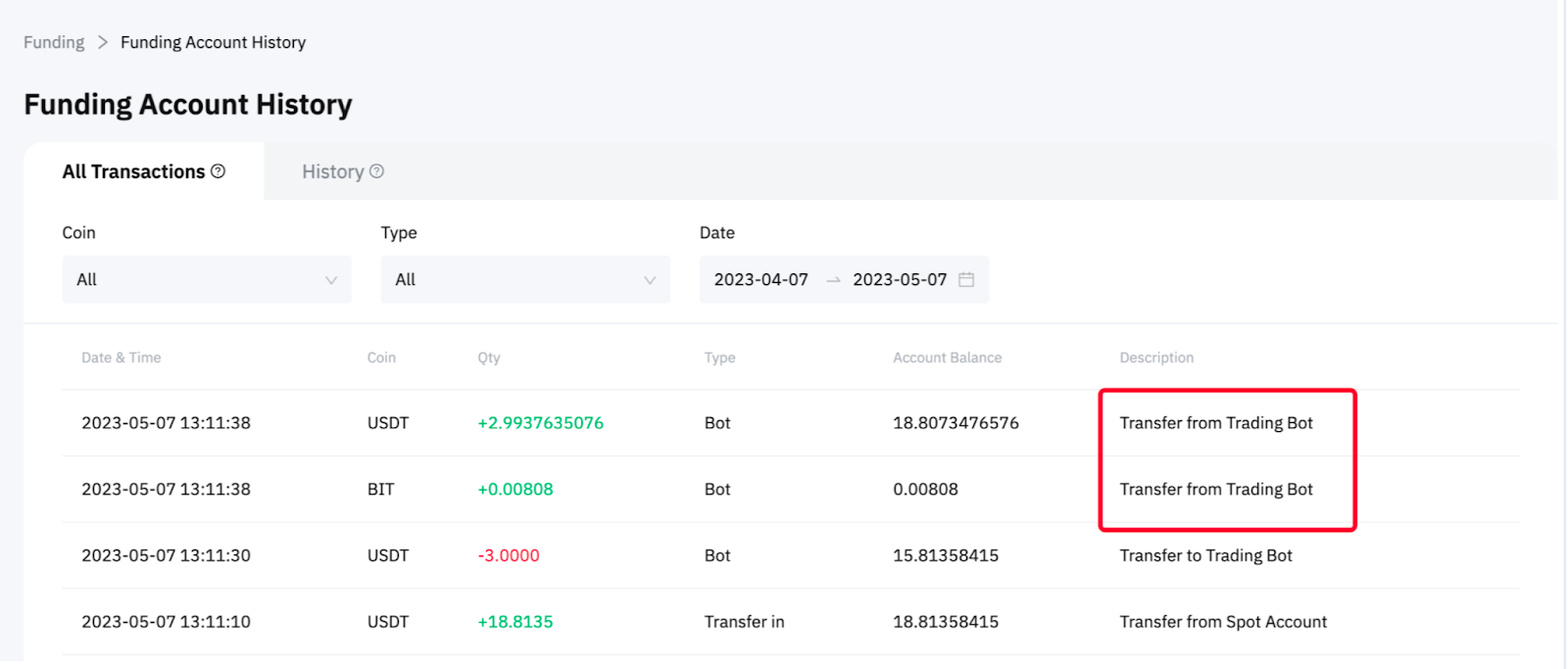 Нажмите на Активы → Аккаунт Финансирования → История → Выберите Бот во вкладке Тип на странице Всех транзакций.