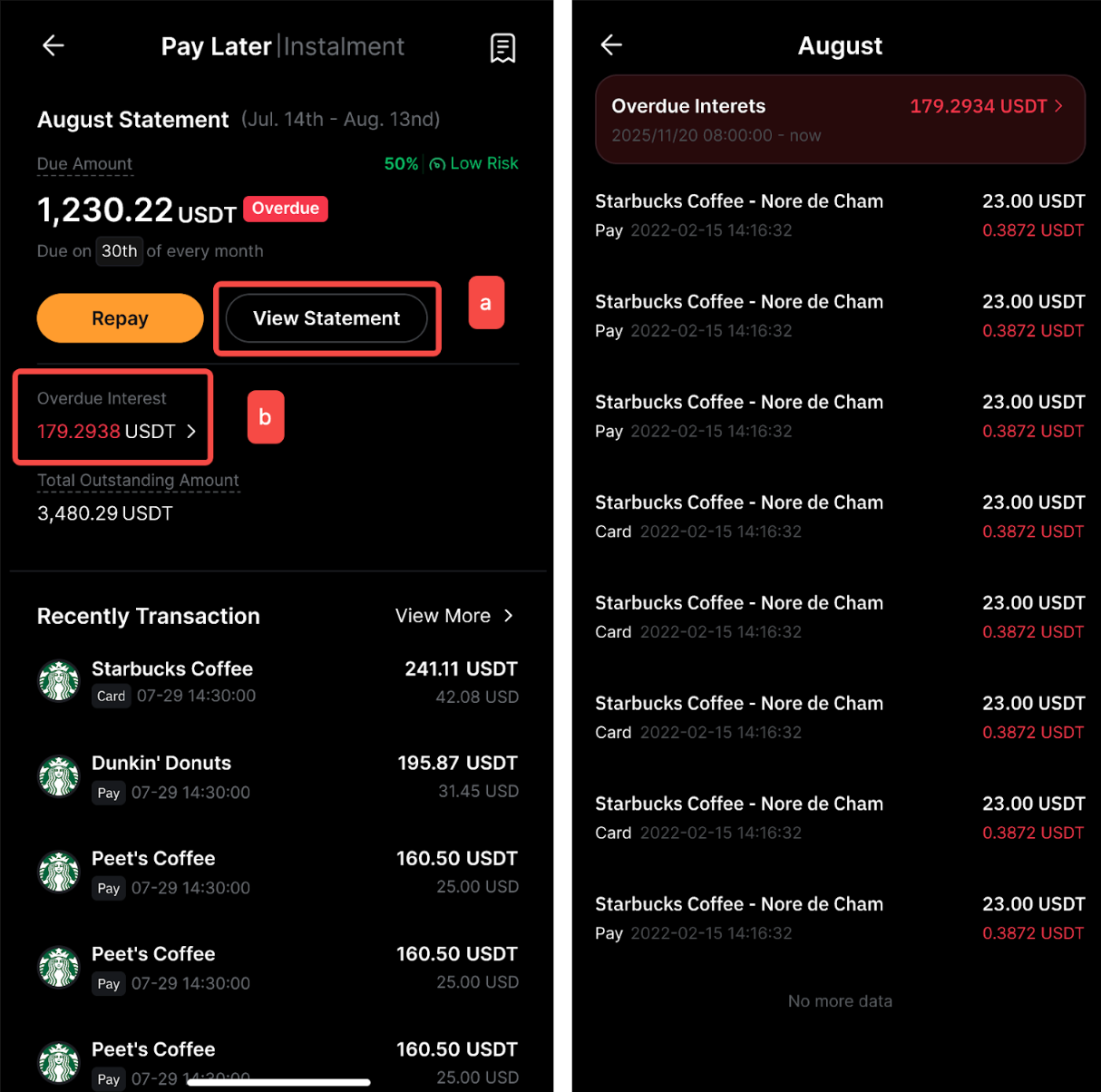 Нажав на Платеж на странице Bybit Pay, Оплата позже → (a) Просмотреть выписку или (b) Просроченный процент, вы можете увидеть сумму просроченных процентов и их подробную разбивку.