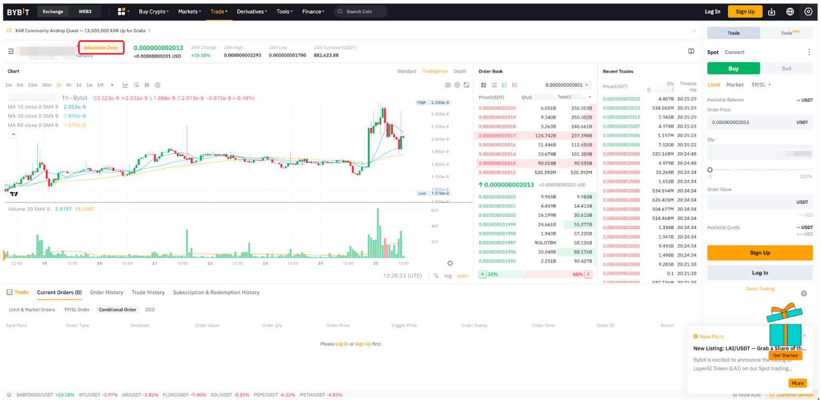 Либо введите нужную торговую пару в строке поиска и откройте страницу этой торговой пары. Если торговая пара находится в Зоне приключений, соответствующая отметка будет отображена в правой части названия торговой пары.