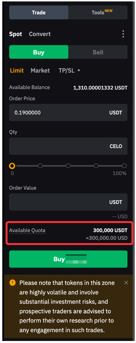 Эту информацию можно найти в разделе «Доступная квота» на странице торговли. Например, если доступная квота для АБВ составляет 300 000 USDT, а цена АБВ составляет 0,5 USDT, то максимальное количество АБВ, которое можно хранить на аккаунте, составляет 600 000 монет (рассчитывается как 300 000 USDT ÷ 0,5 USDT = 600 000 монет).