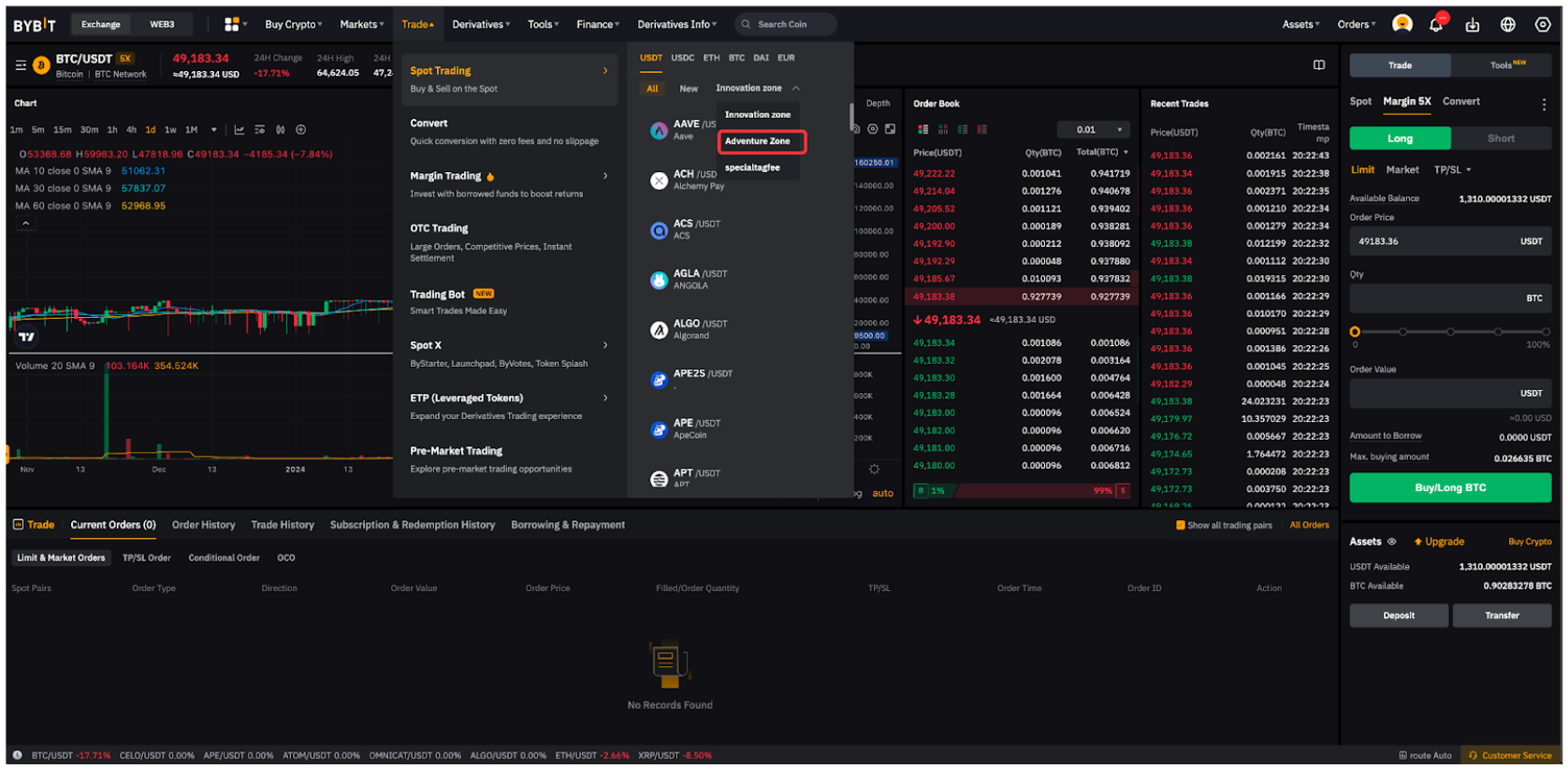 Чтобы перейти к торговым парам в Зоне приключений, нажмите «Торговать»«Спотовая торговля», и в раскрывающемся меню нажмите «Зона приключений».