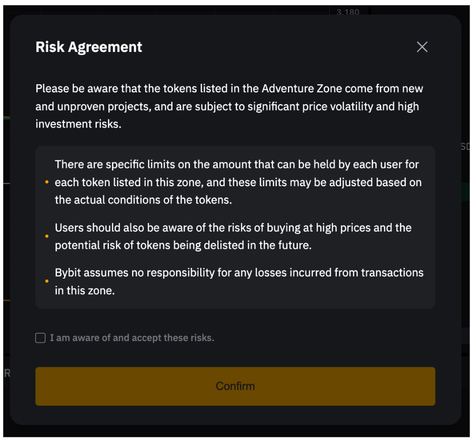 Обратите внимание, что Bybit не несёт ответственности за убытки в результате транзакций в Зоне приключений. Мы рекомендуем пользователям тщательно оценивать проекты и риски, а также принимать такие инвестиционные решения, которые соответствуют финансовым возможностям и допустимым рискам.