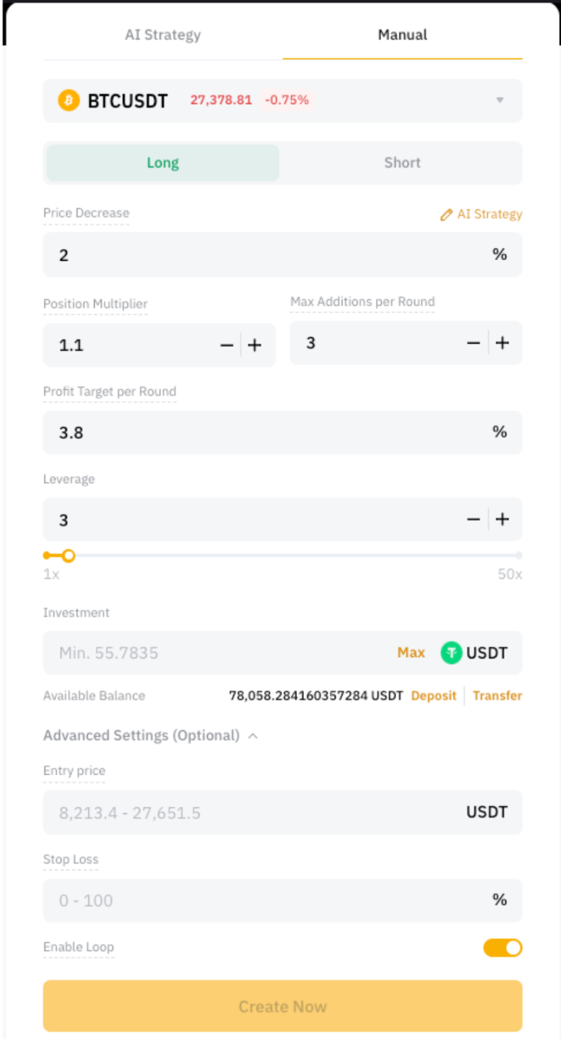 В интерфейсе создания бота Фьючерсный Мартингейл можно выбрать один из двух режимов: ИИ-стратегия или ручной режим. В режиме «ИИ-стратегия» параметры автоматически корректируются для реализации оптимальной стратегии, которая определяется искусственным интеллектом на основе исторических данных.