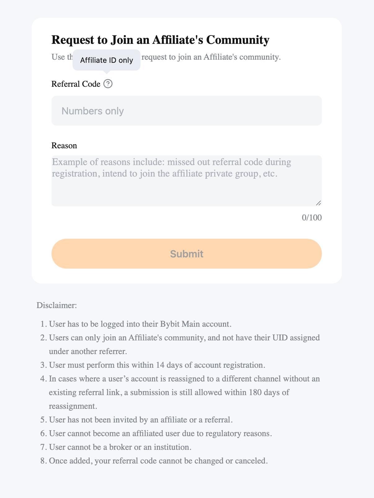 Пользователи по разным причинам могут пропустить добавление партнёрского или реферального кода KOL при регистрации. Поэтому теперь Bybit поддерживает добавление пригласительного кода вручную в течение 14 дней после регистрации, чтобы присоединиться к сообществу партнёра.