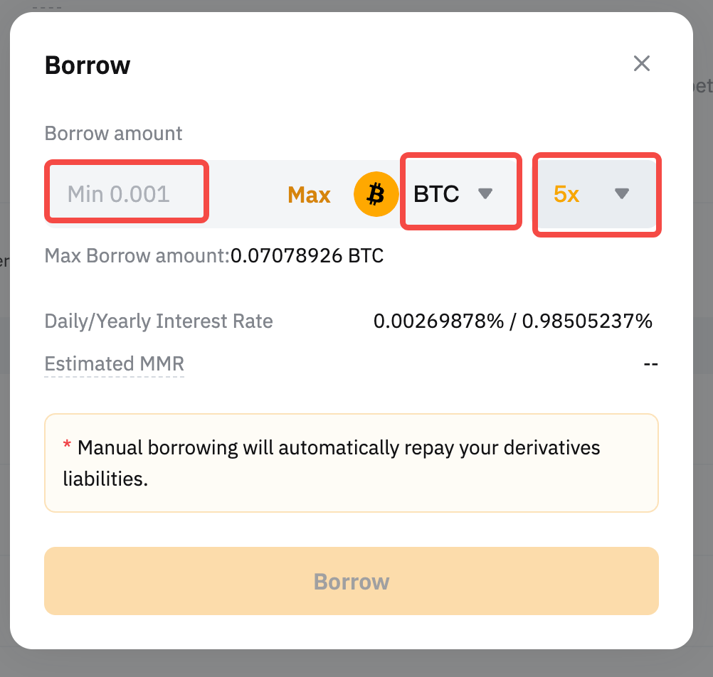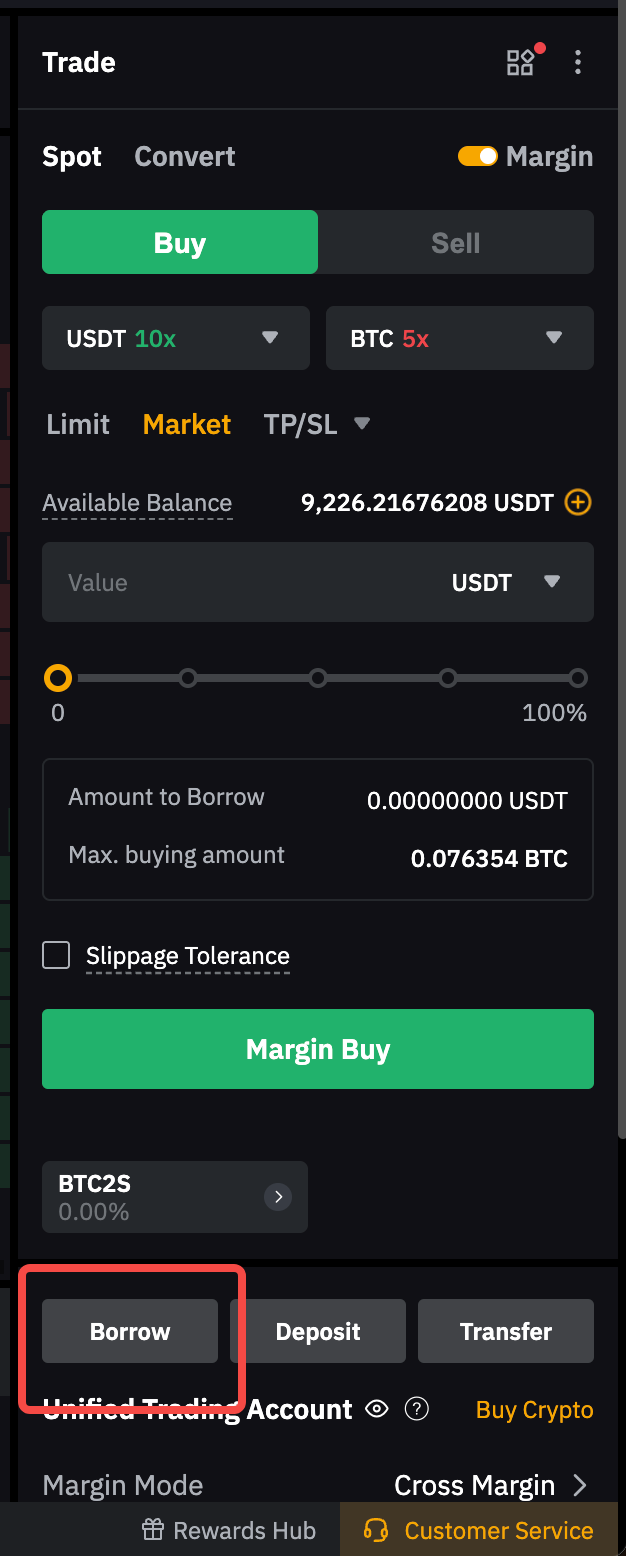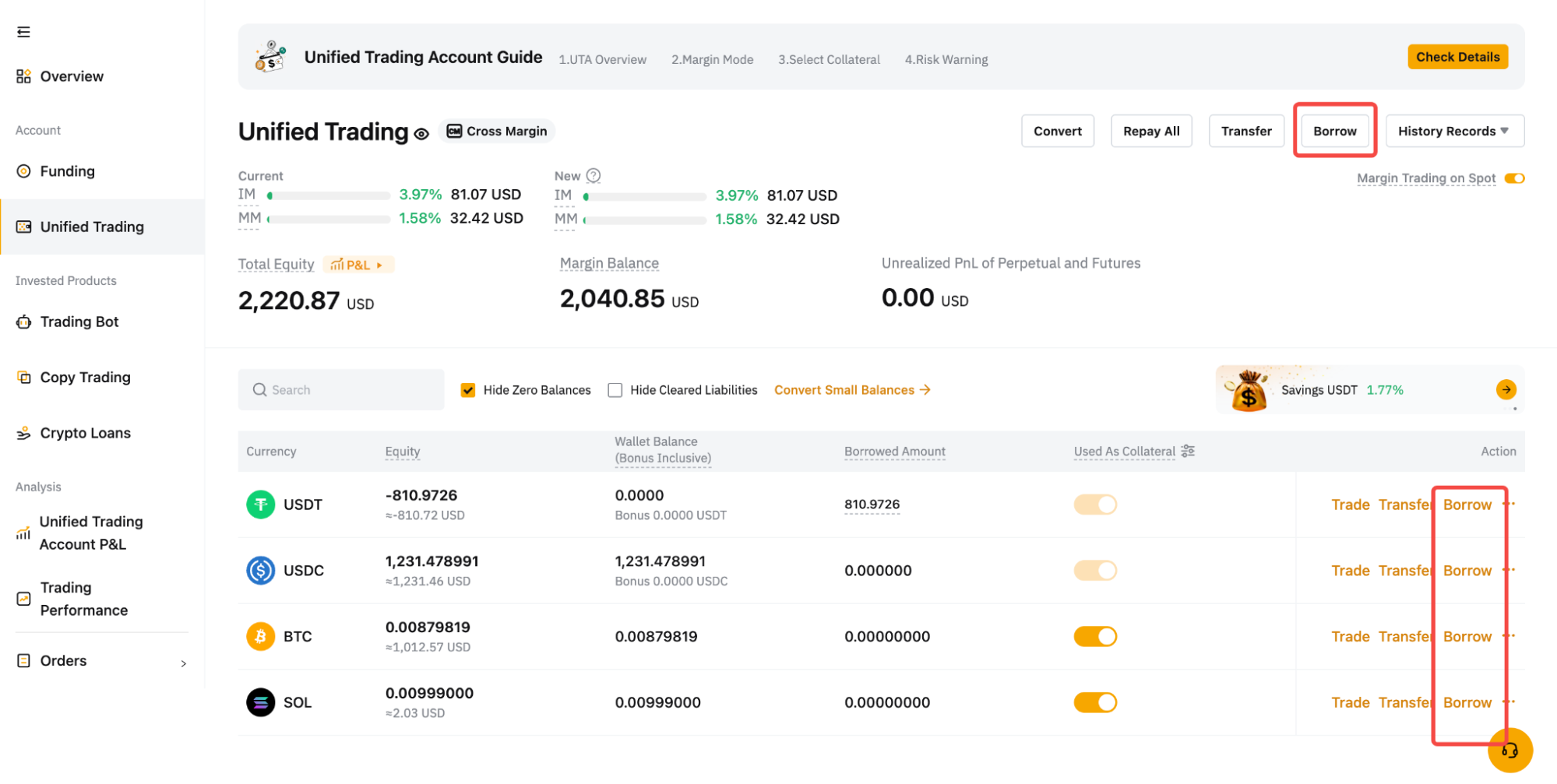 Занимайте средства непосредственно на странице маржинальной торговли на споте или на странице активов Единого торгового аккаунта (ЕТА). |
