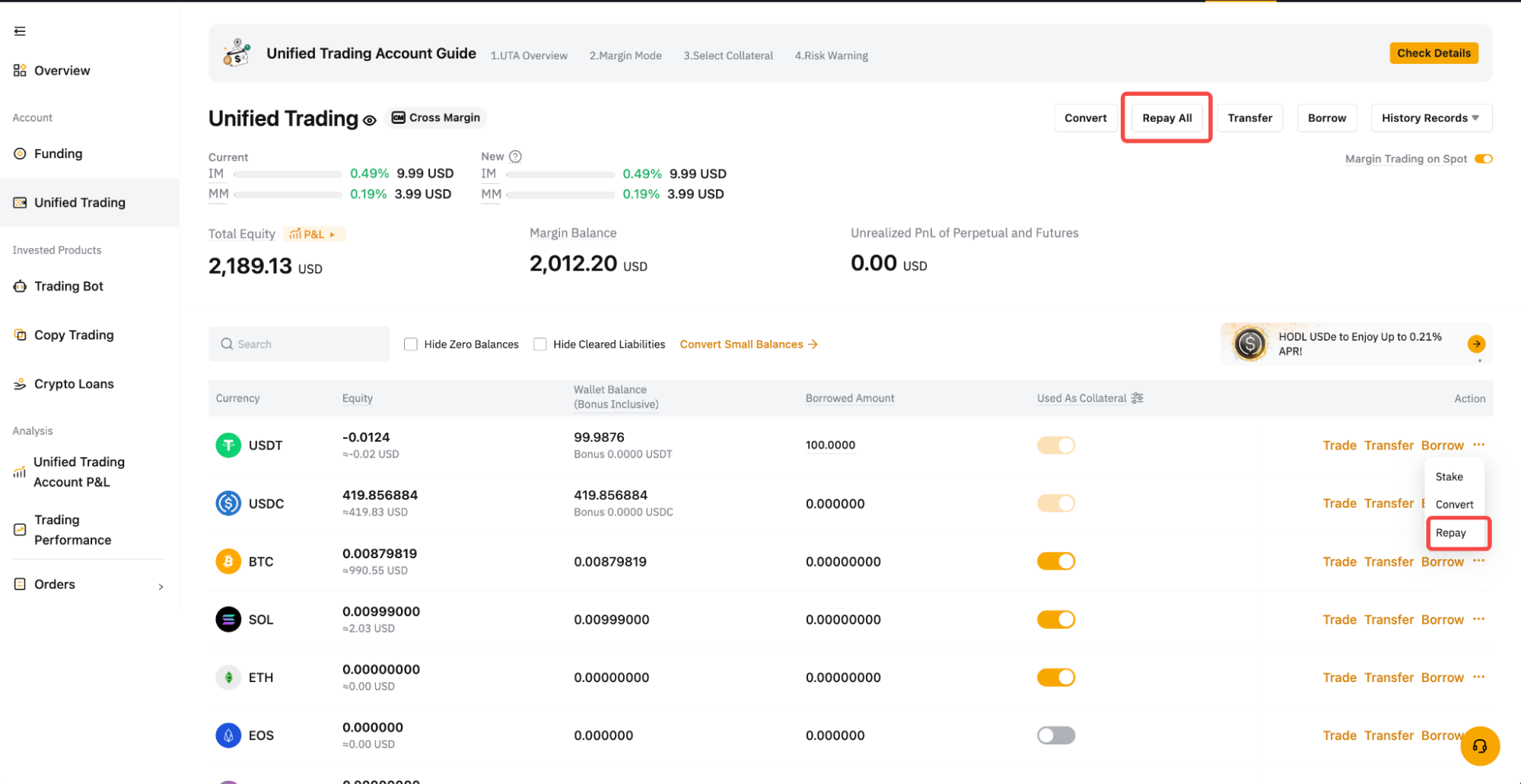 Для погашения займа нажмите Погасить рядом с заемным активом или нажмите Погасить все, чтобы погасить все займы. Подробная информация доступна в статье Как на Едином торговом аккаунте выполнить погашение вручную.