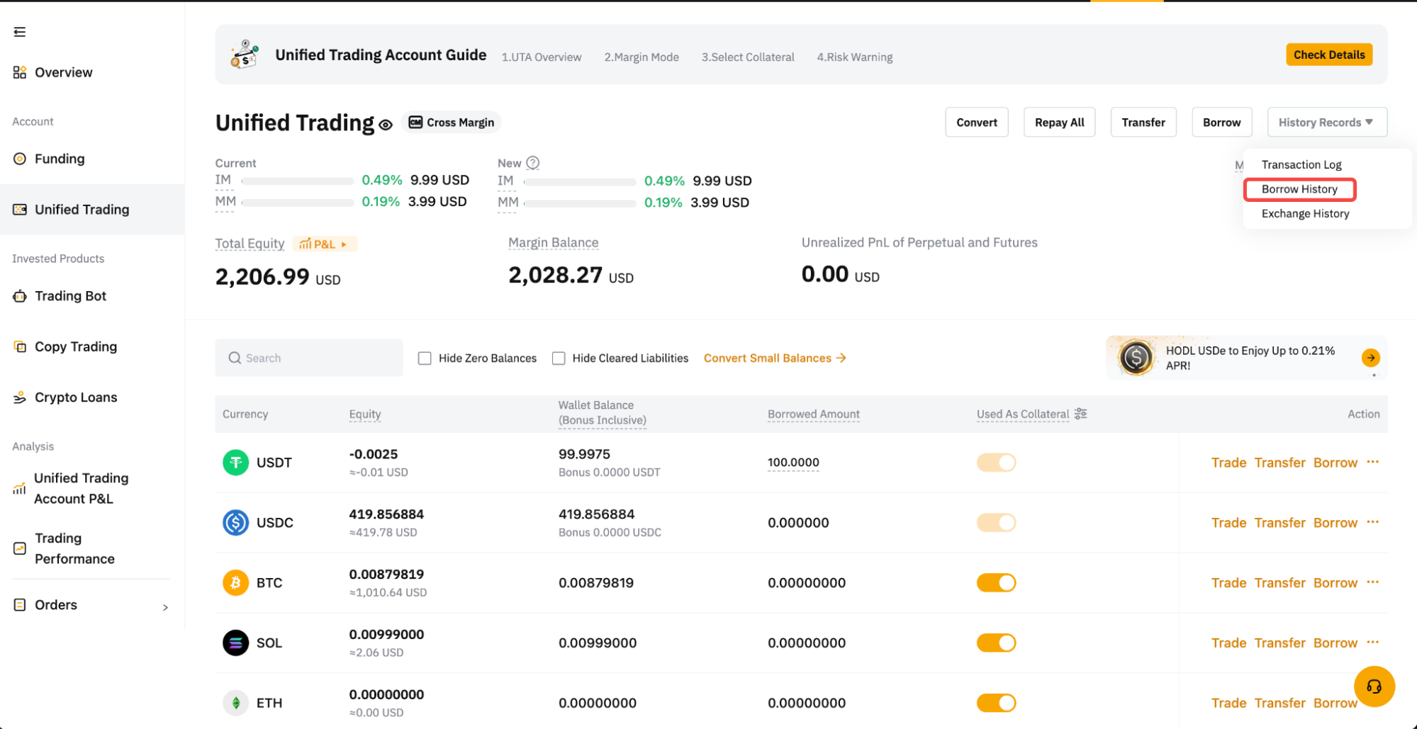 Шаг 3. После оформления займа можно проверить сумму займа каждой монеты в Едином торговом аккаунте. Для этого перейдите в раздел История займов.