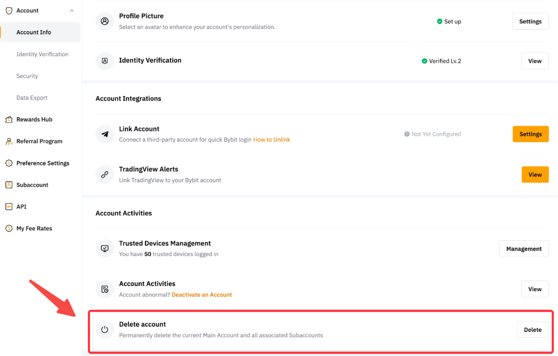 Bybit запустил функцию самостоятельного удаления аккаунта, которая позволяет пользователям удалять свои аккаунты на странице Аккаунт.