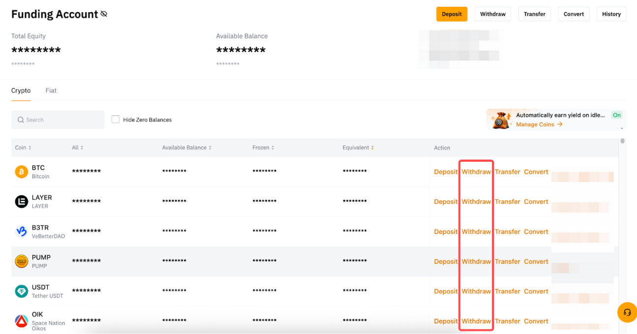 Или перейдите на страницу аккаунта Финансирования и нажмите Вывести под монетой, которую хотите вывести.