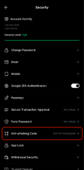 Чтобы снизить риск фишинга, Bybit настоятельно рекомендует настроить код защиты от фишинга через веб-сайт или мобильное приложение. Если вы ещё не активировали антифишинговый код, перейдите на страницу Аккаунт и безопасность и следуйте этому руководству.