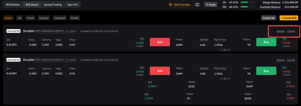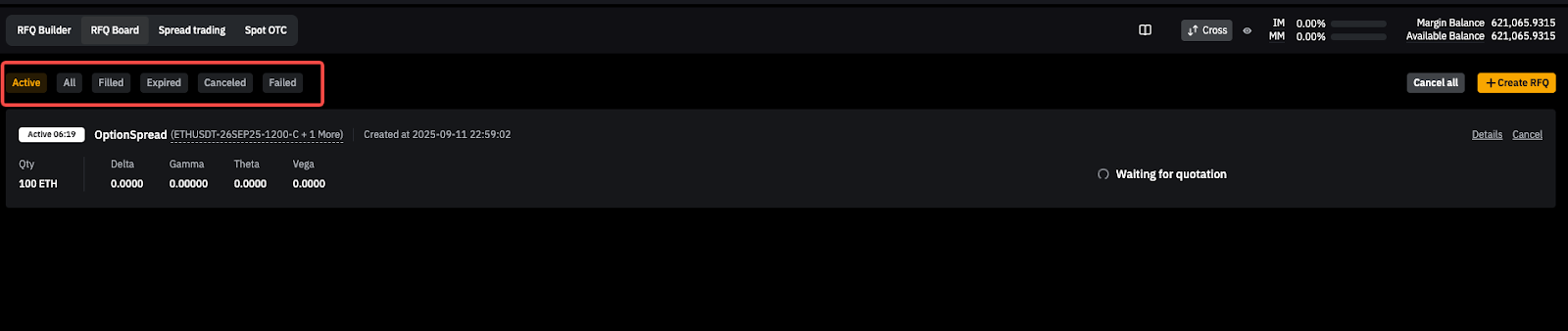 После отправки RFQ вы можете отслеживать его и просматривать котировки от поставщиков ликвидности на панели RFQ.