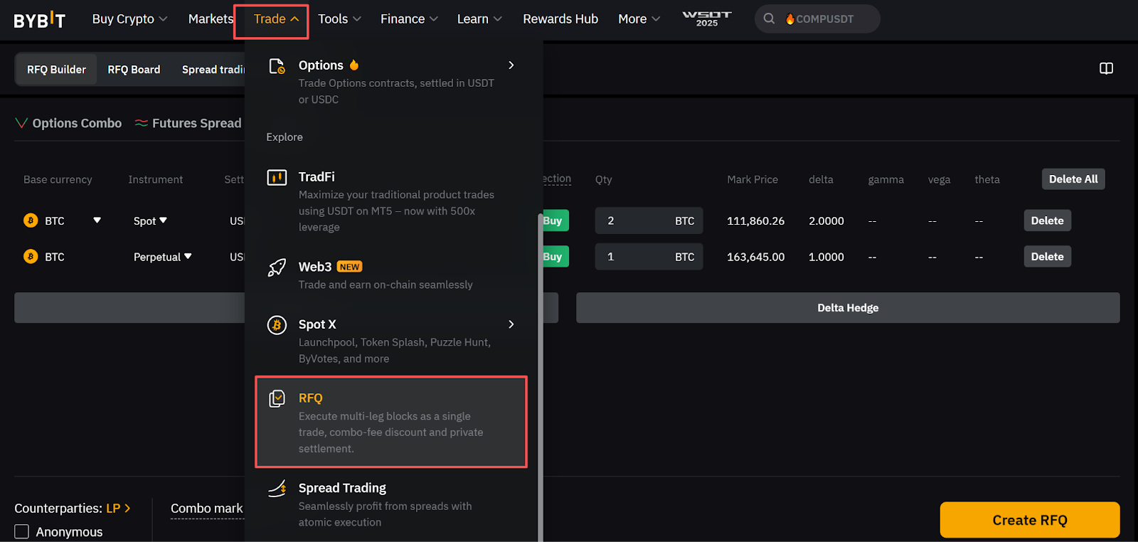 Шаг 1. Чтобы перейти на страницу RFQ, войдите на сайт Bybit и на панели навигации нажмите Торговать → RFQ.