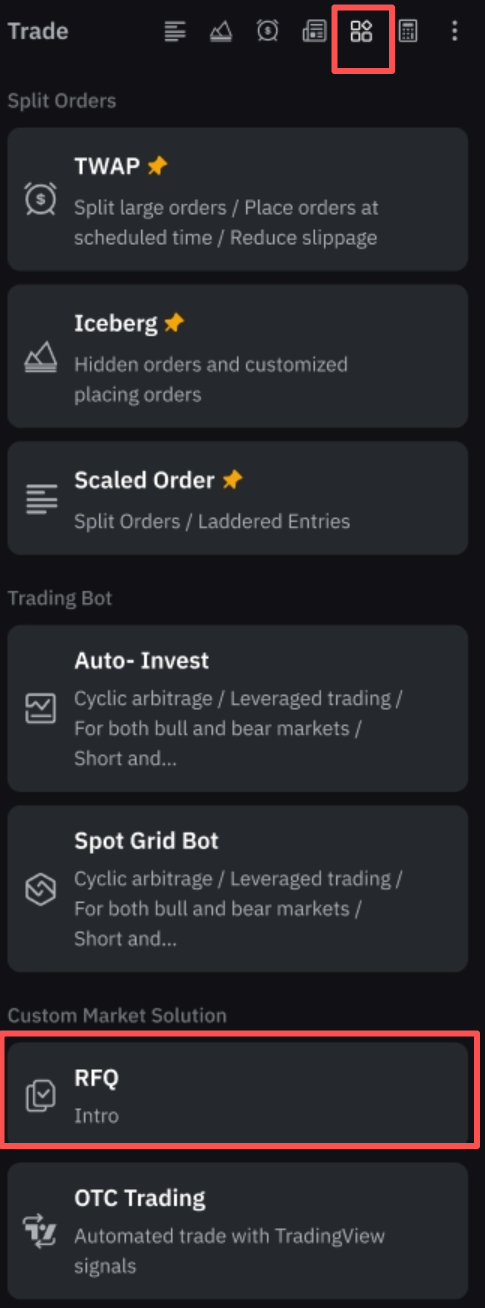 Кроме того, к RFQ можно перейти на странице Спот/Фьючерсы, нажав на значок Инструменты на панели Торговать справа.