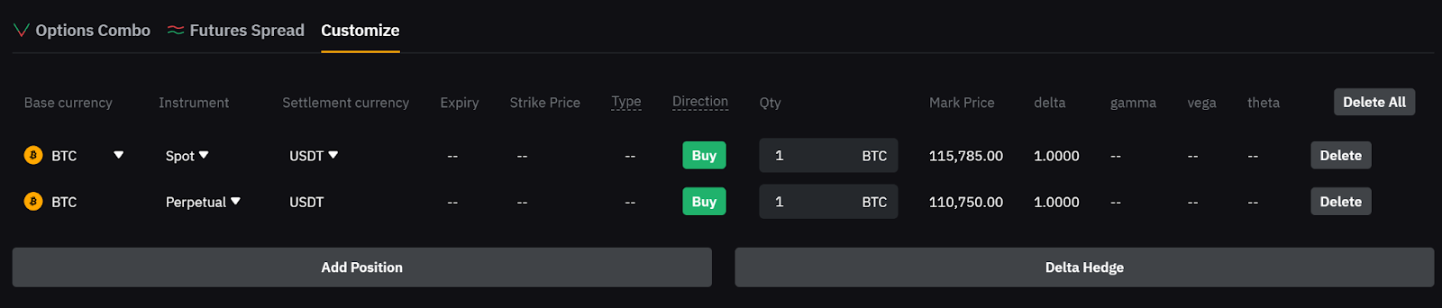 — Чтобы хеджировать риск, нажмите Дельта-хеджирование, и система автоматически добавит позицию хеджирования.