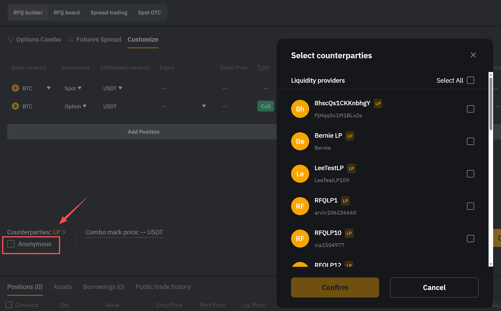 Шаг 6. После настройки стратегии нажмите кнопку LP (поставщик ликвидности) в левом нижнем углу, чтобы выбрать одного или нескольких контрагентов. Для максимальной конфиденциальности поставьте галочку Анонимный.