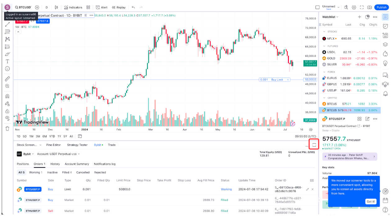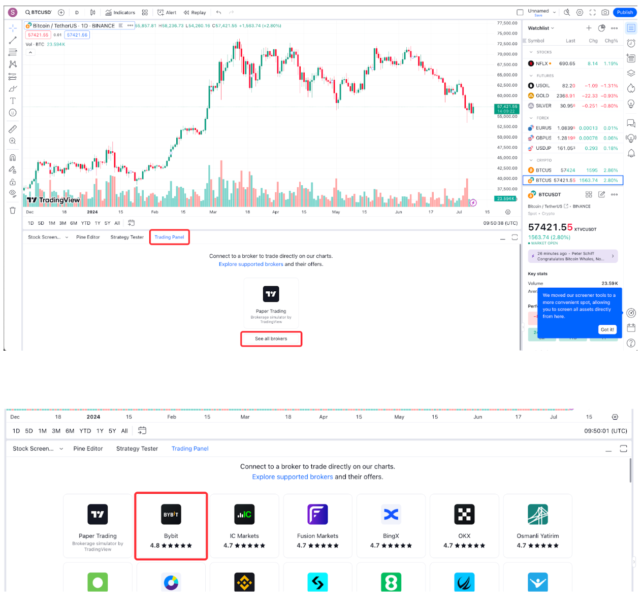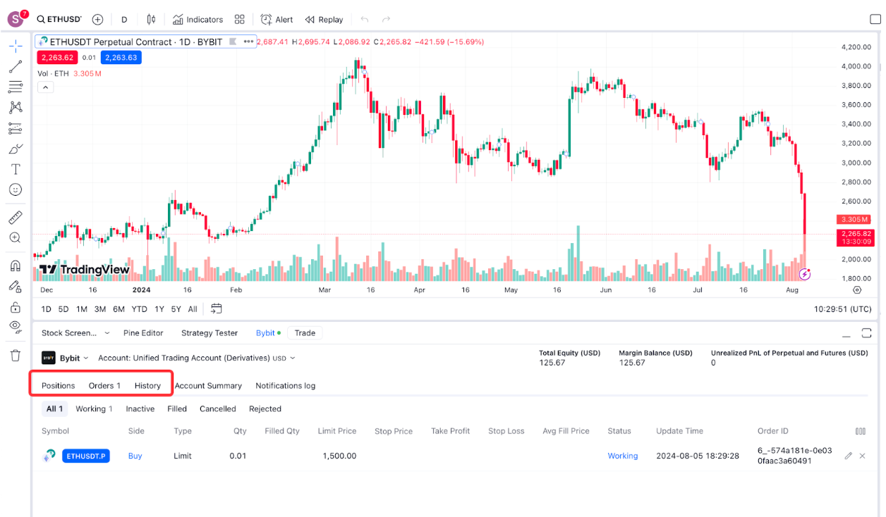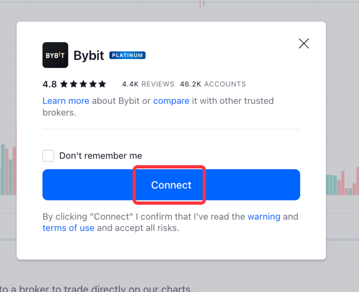 Обратите внимание, что текущий статус после подключения к брокеру на TradingView может поддерживаться только в течение 24 часов из-за ограничений, налагаемых TradingView в целях безопасности. Подробная информация о торговле на Bybit через TradingView доступна по ссылке.