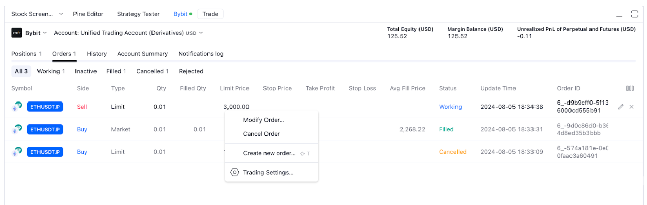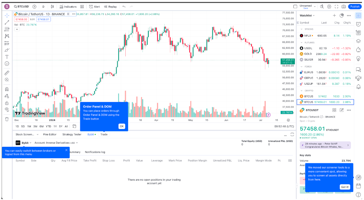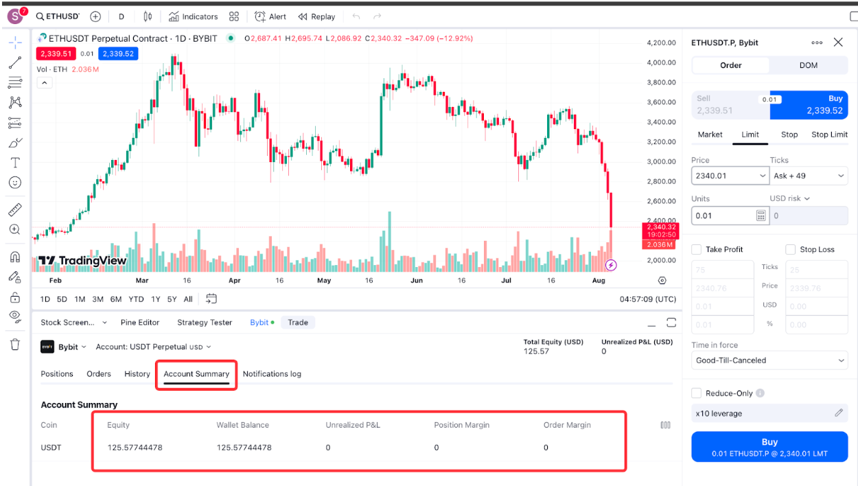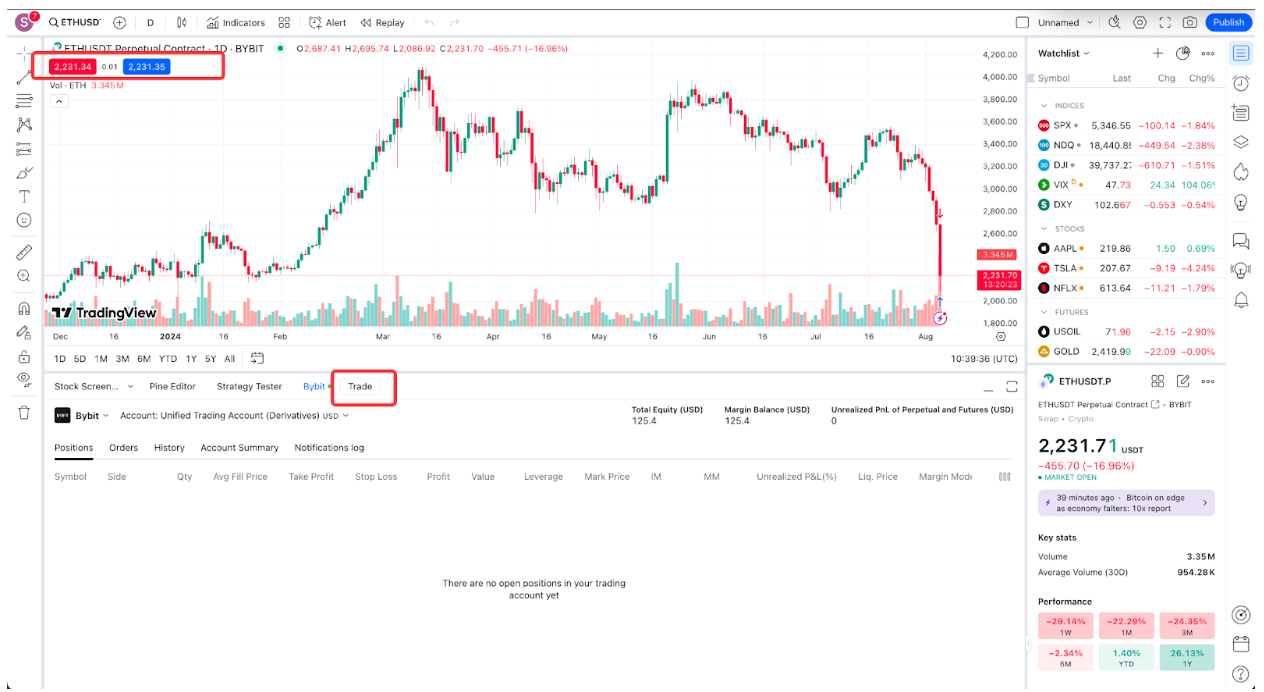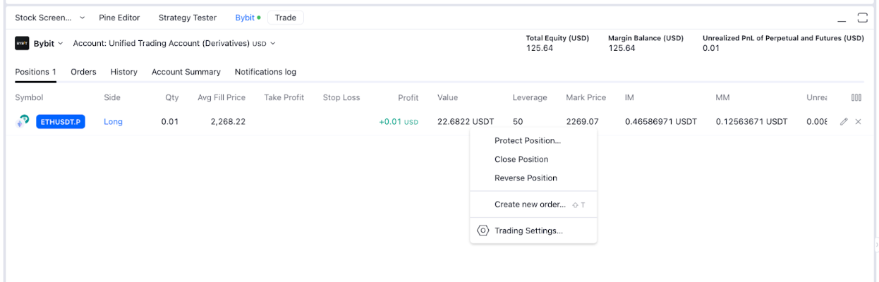 Шаг 5. После подключения к брокеру Bybit можно торговать на Bybit через TradingView.