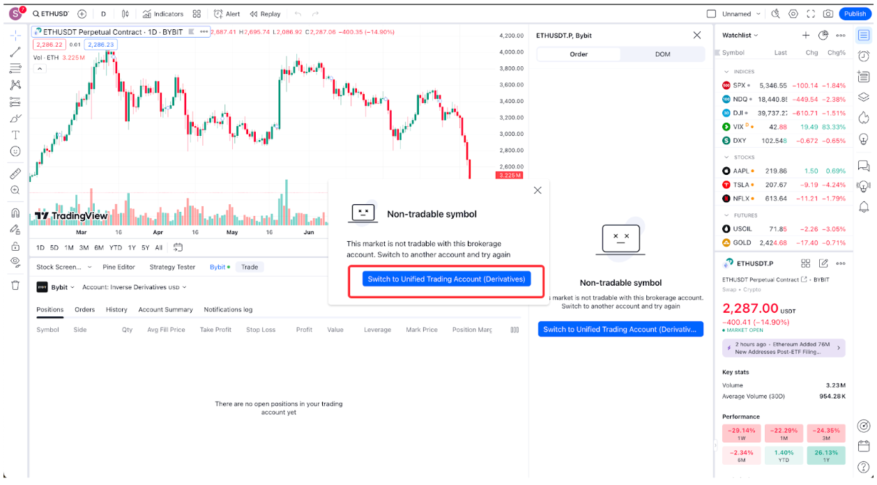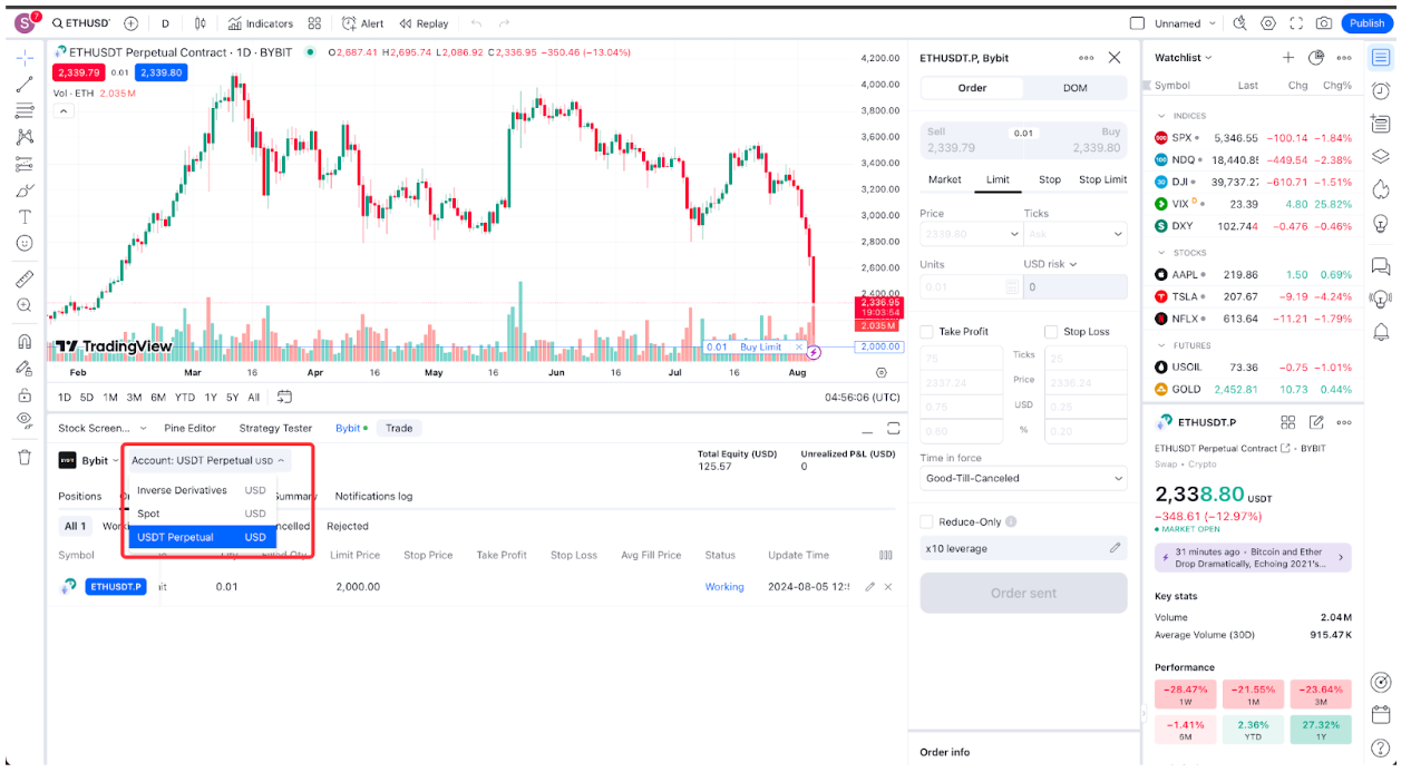 В этом руководстве мы расскажем о торговле на Bybit с помощью TradingView. Вы узнаете, как подключить аккаунт Bybit (основной аккаунт или субаккаунт) к TradingView, размещать и управлять ордерами и многое другое. В настоящее время TradingView поддерживает торговлю на Bybit на споте, инверсных бессрочных, USDT и USDC бессрочных контрактах.