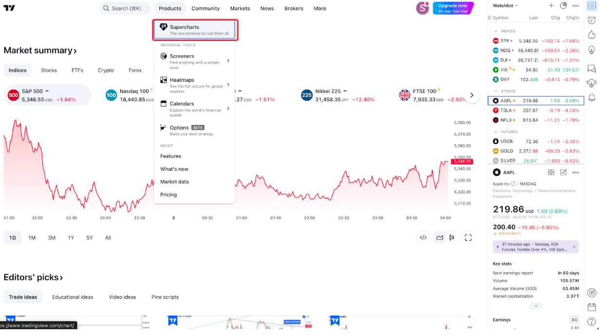 Шаг 1. Войдите в аккаунт TradingView. На главной странице нажмите на Продукты → Суперграфики.