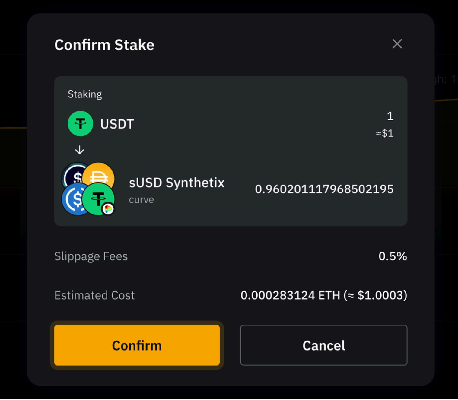 Шаг 2. Во всплывающем окне проверьте детали ордера на стейкинг. Обратите внимание на проскальзывание и расчётную стоимость и нажмите Подтвердить.