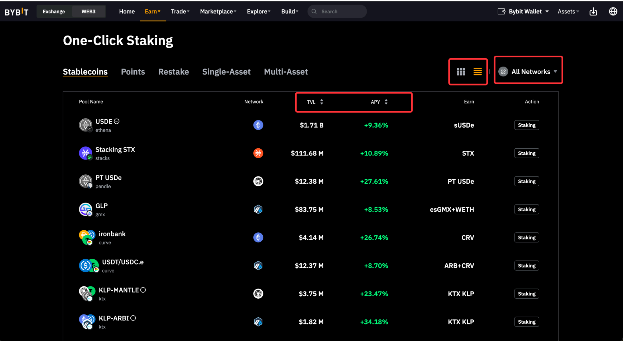 Шаг 1. На странице стейкинга можно просмотреть все доступные пулы стейкинга. Нажмите на значок сетки или списка, чтобы изменить отображение. Можно разместить пулы в соответствии с APR или TVL или нажать Все сети, а также просмотреть пулы стейкинга по сети.